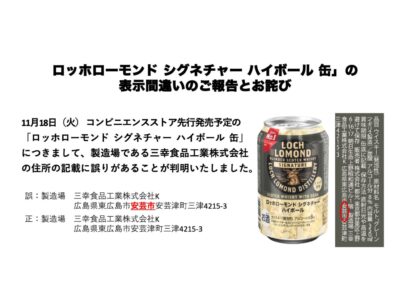 2025年11月18日(火)より、「ロッホローモンドシグネチャー ハイボール缶」を全国のコンビニエンスストア(一部扱いなし)で先行発売いたします。また、12月9日(火)より数量限定 …