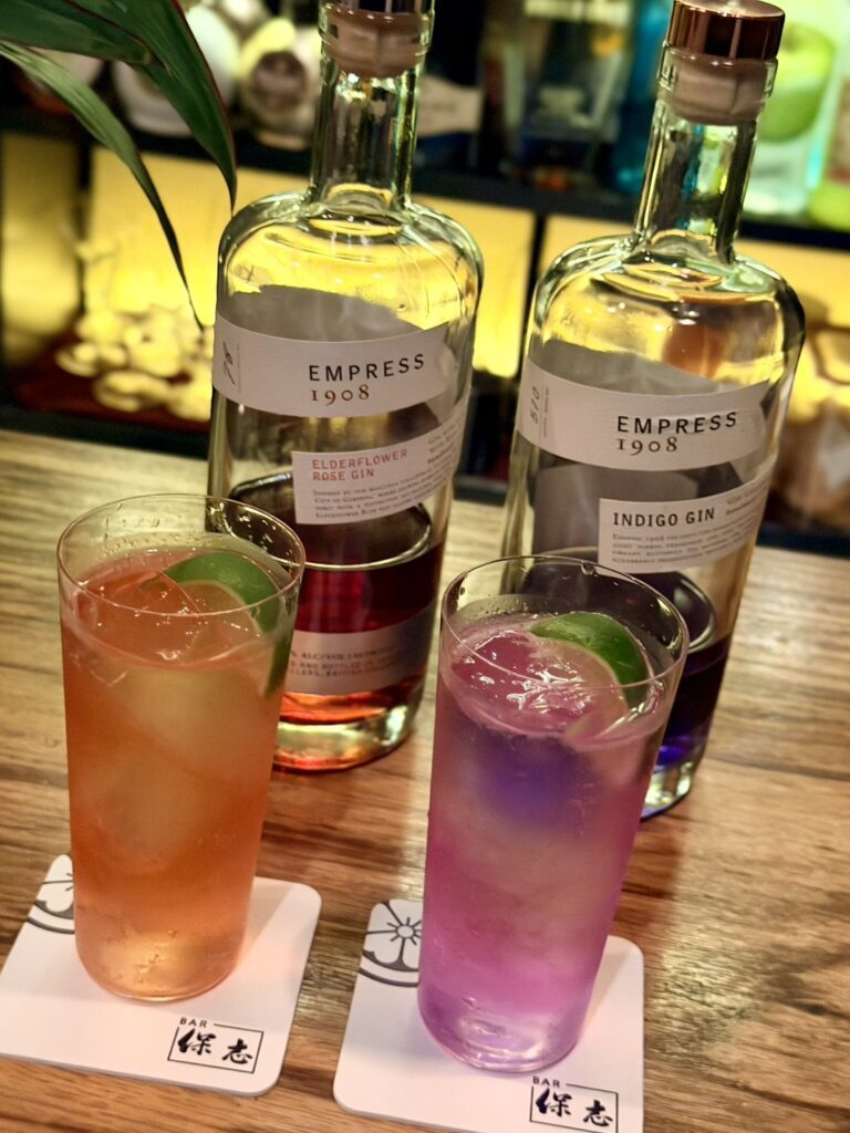深い青色が特徴的な〈エンプレス 1908 ジン〉(通称インディゴ)はボタニカルに使用されるバタフライピーがトニックの酸に反応し色が変わり、幻想的なバイオレットに。